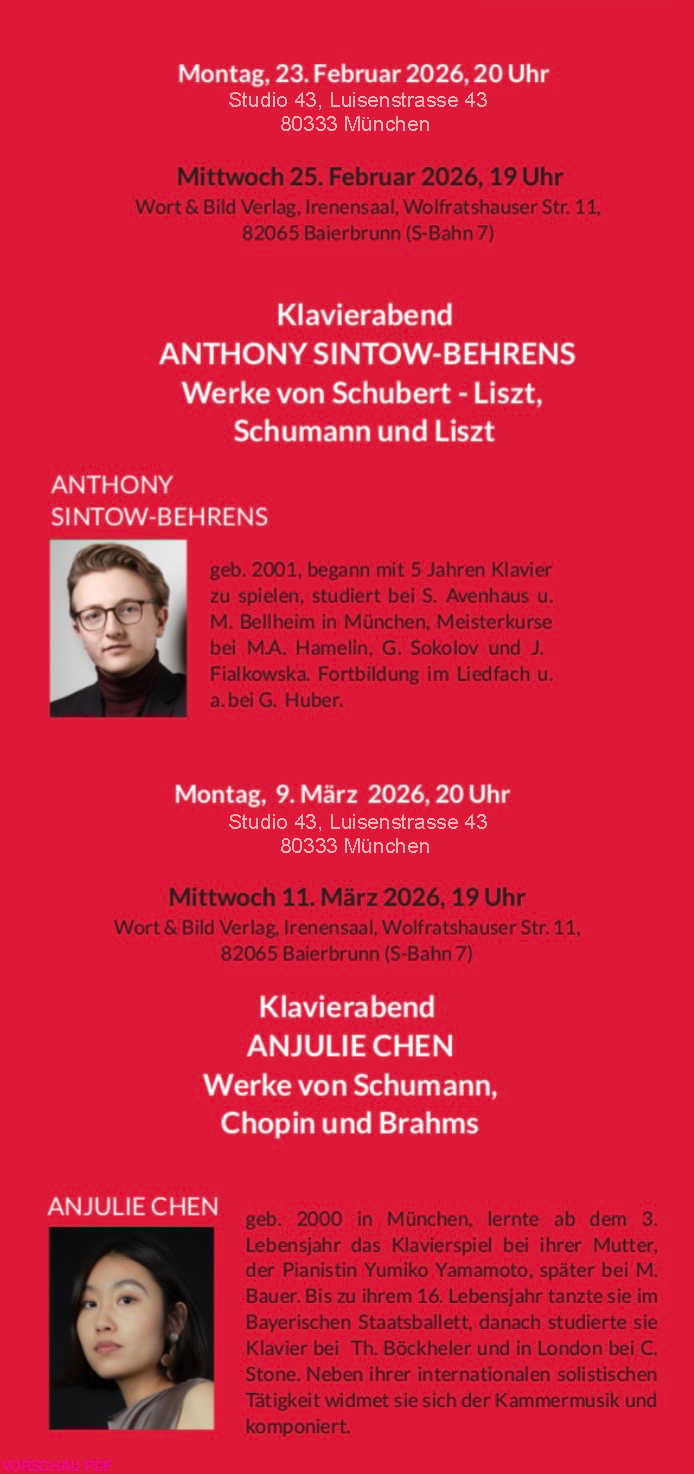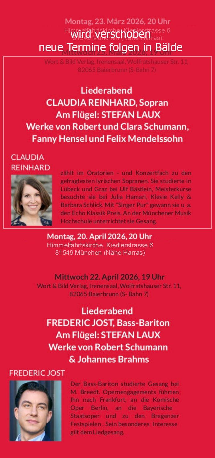 Stefan Wilkening (Residenztheater München). Sie präsentieren ein Programm mit Mozart-Briefen und Klaviermusik: "Wenn Du mir in mein Herz schauen könntest!" sowie eines über Schubert mit dem Titel "Ich träumte von bunten Blumen", basierend auf Briefen, Tagebüchern des Komponisten und Zeugnissen seiner Freunde.